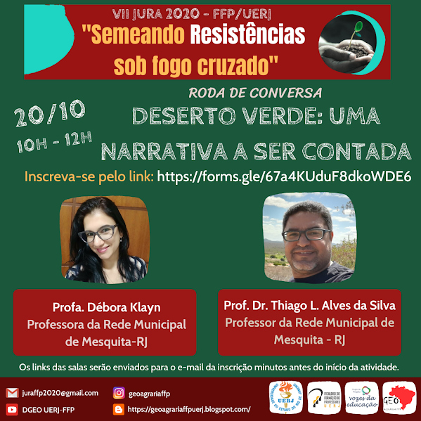 Na roda de conversa "Deserto Verde, uma narrativa a ser contada", os professores da rede municipal de Mesquita-RJ, Thiago Lucas Alves da Silva (doutor em Geografia pela UFF e professor colaborador do GeoAgrária) e Débora Ventura Klayn Nascimento (doutoranda no Programa Interdisciplinar de Linguística Aplicada na UFRJ) debateram a respeito da violação de direitos e os impactos ambientais dos monocultivos de árvores, bem como a sua introdução no estado do Rio de Janeiro. Essa roda de conversa foi mediada pelos alunos Leonam Bonato da Silva e Roberta da Costa Lines, mestrandos do Programa de Pós-Graduação em Geografia da FFP-UERJ e integrantes do GeoAgrária.
